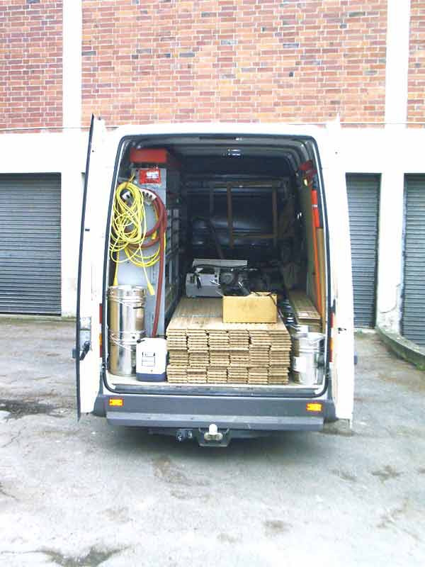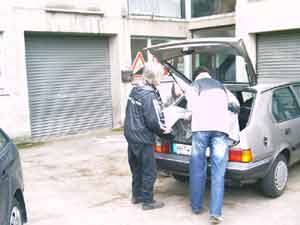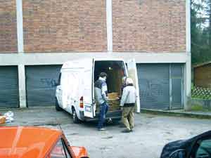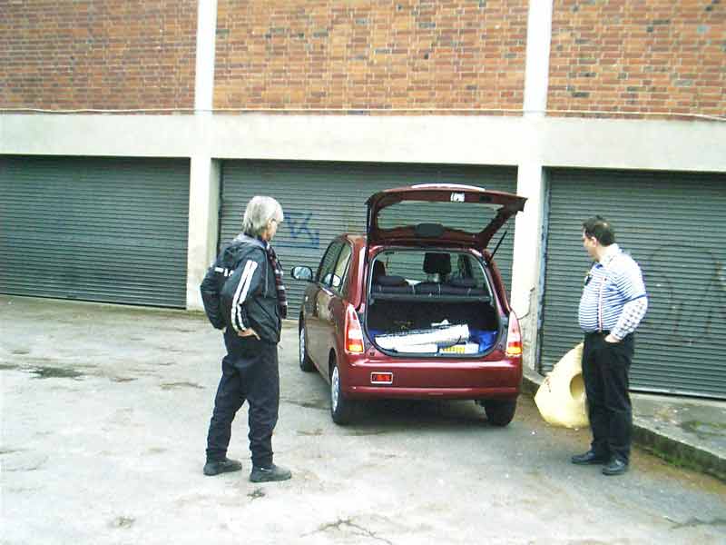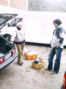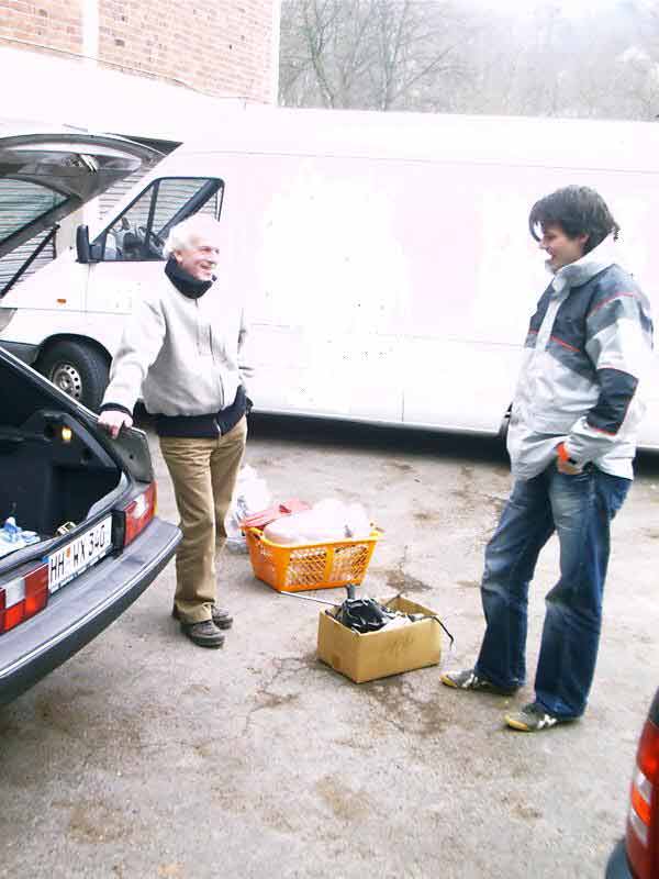 Der Gast und Wolfgang diskutieren, wer die Sachen jetzt zum Transporter tragen soll..