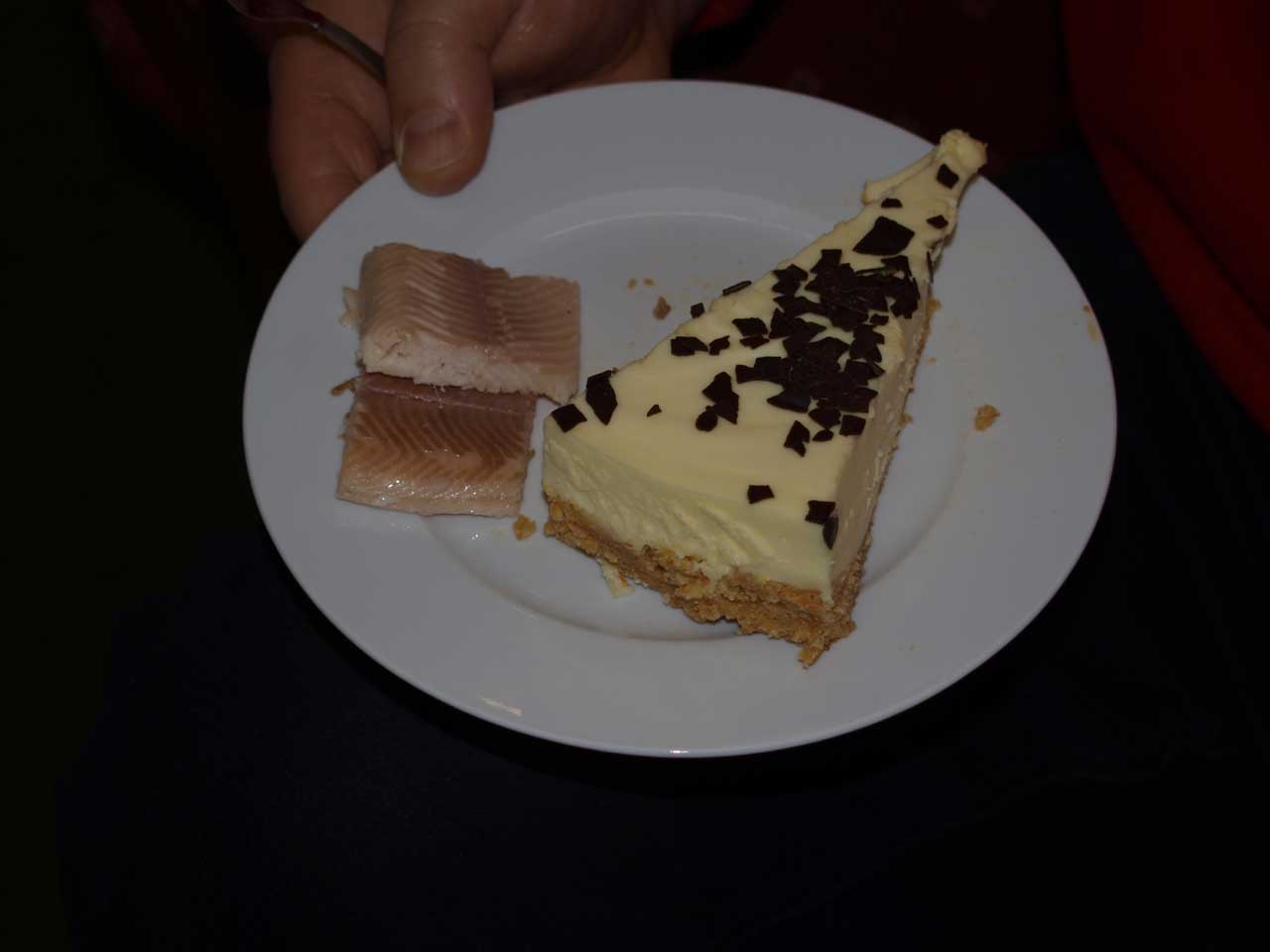 Ich seh doch richtig Forelle und Torte auf einem Teller !!!