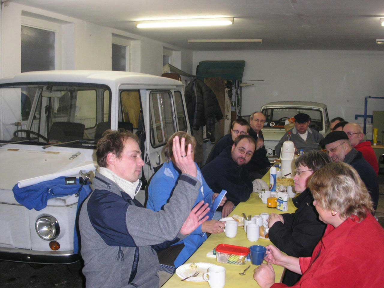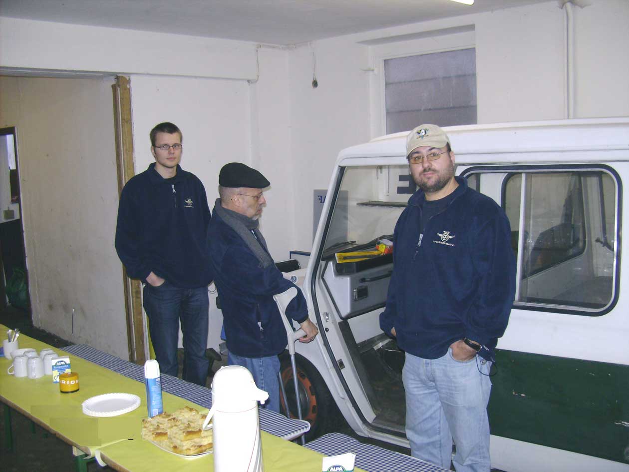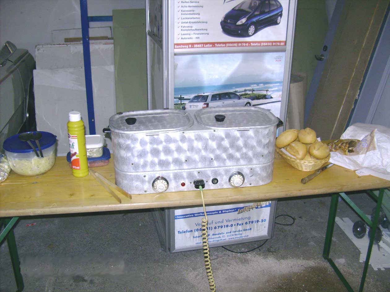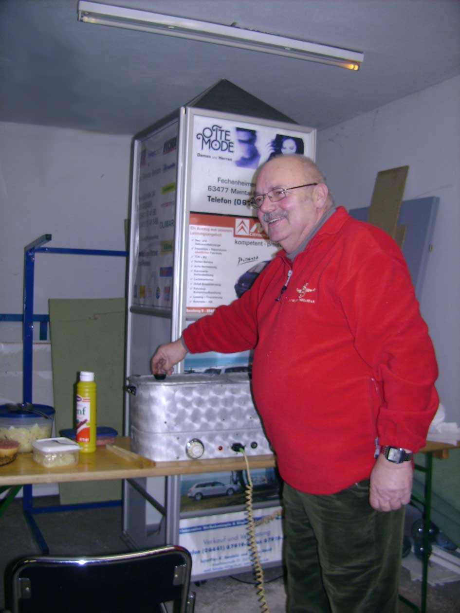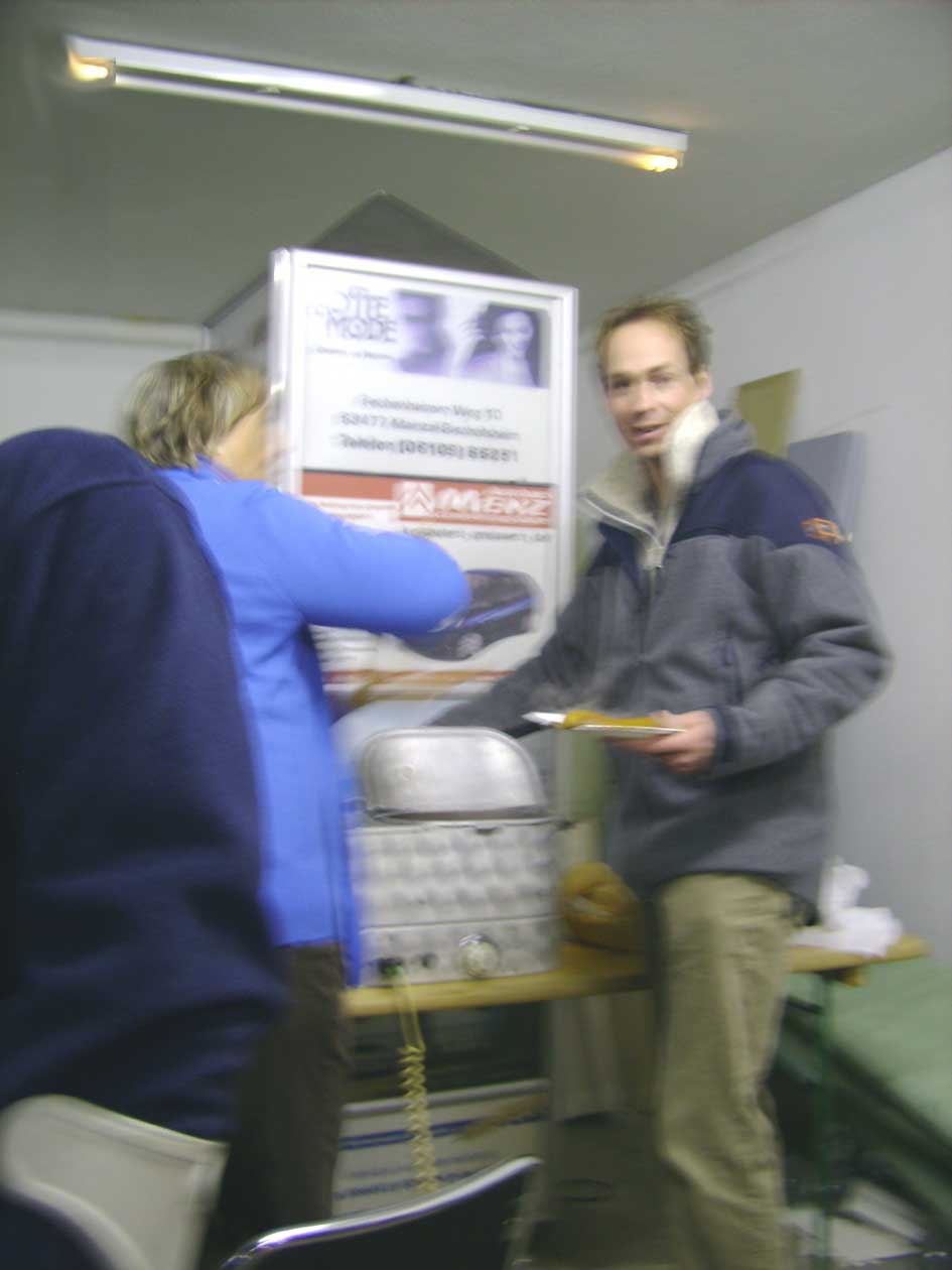 ( und natürlich später wieder abgeholt hat ! Weiterhin danken wir Herrn Reschke (Renate und Jockels Vermieter) für die Gasflasche und Gregor Klose für den Heiz-Strahler. Klaus hat einen 53 Jahre alten Würstchenkocher mitgebracht, der die Wiener und Knacker anständig auf Temperatur brachte. Renate verwöhnte mit Kuchen, Mettbrötchen und Kartoffelsalat. Wir möchten uns bei allen Gästen bedanken, die den zum Teil weiten Weg trotz nasskalten Wetters nach Herdecke fanden. Wir hatten lange Zeit eine Menge Spass. Der Würstchenkocher wurde übrigens für einen der nächsten Stammtische wiederbestellt. Wir sehen uns im Februar wieder !!! |