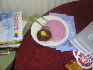 Heringssalat und Frikadelle - Ich muss nicht erwähnen wessen Teller das war? Detlevs... (Das rote soll Johannisbeernachtisch gewesen sein...oder war es Labskaus...)