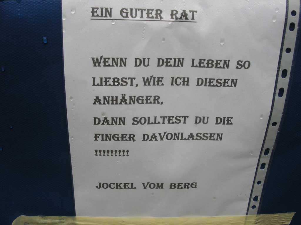 Warnung an Udos Anhänger, der Hänger nebenan war nur mit einem Schloss gesichert