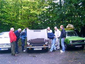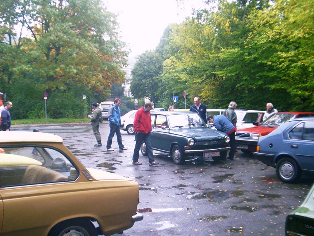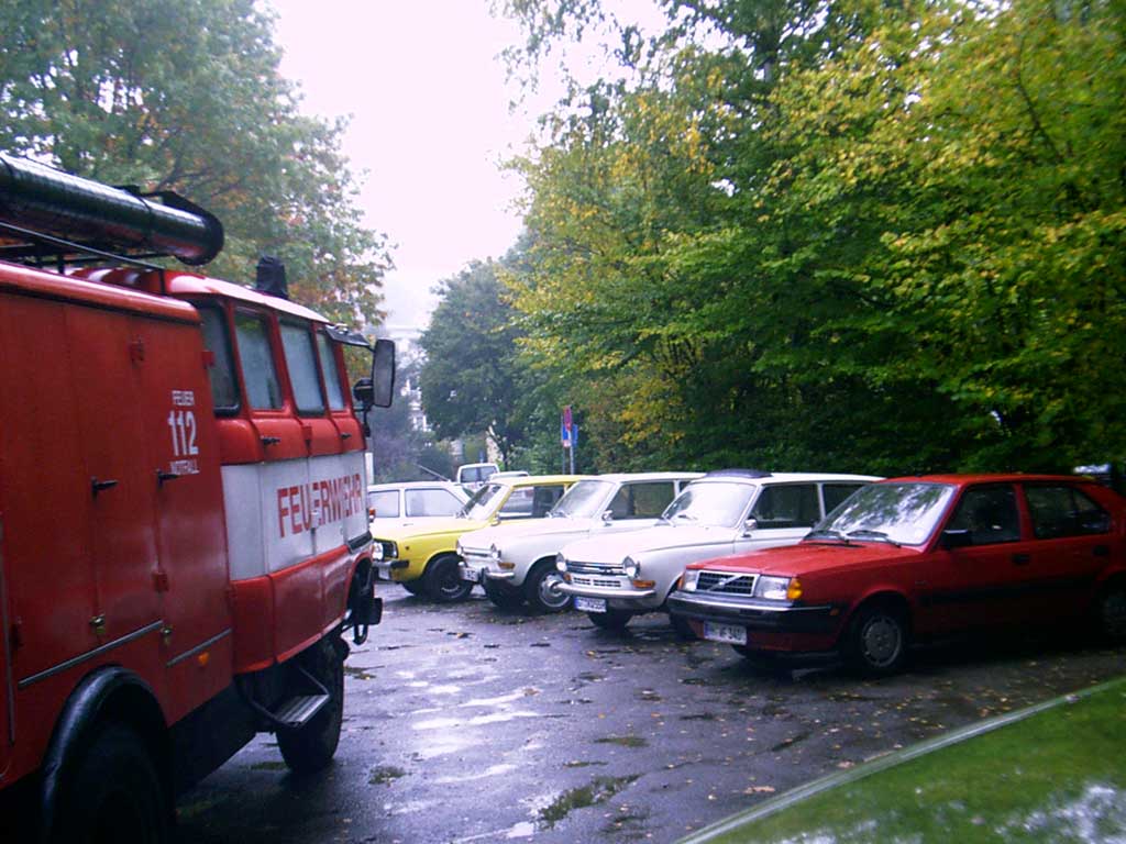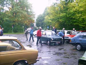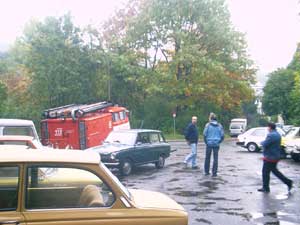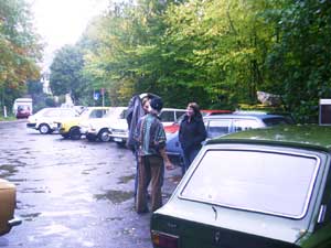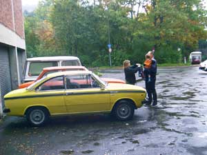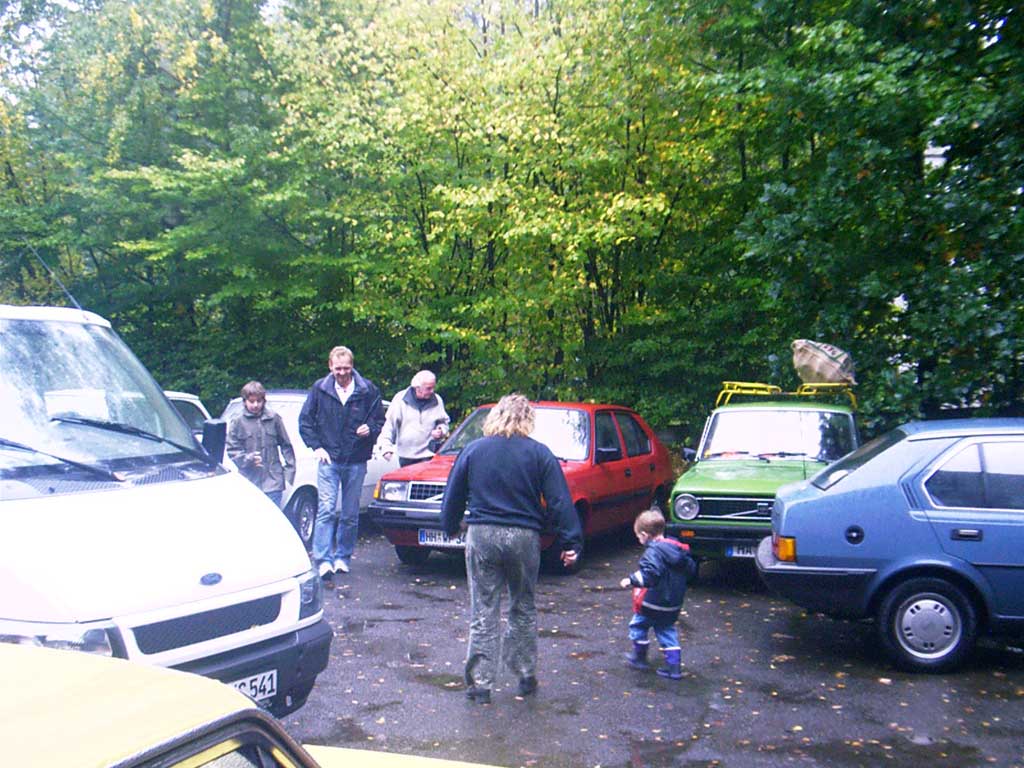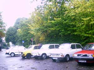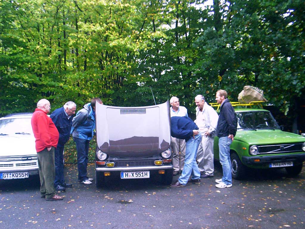 Zwei Gäste kommen standesgemäß im ( blauen ) 340er Volvo