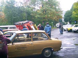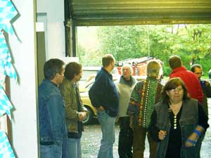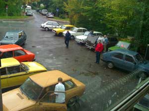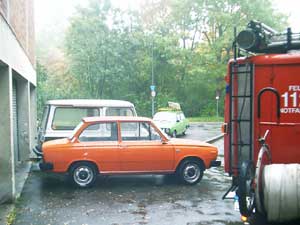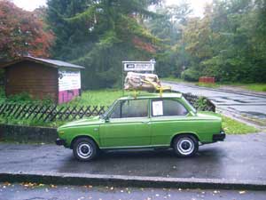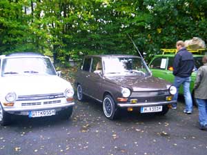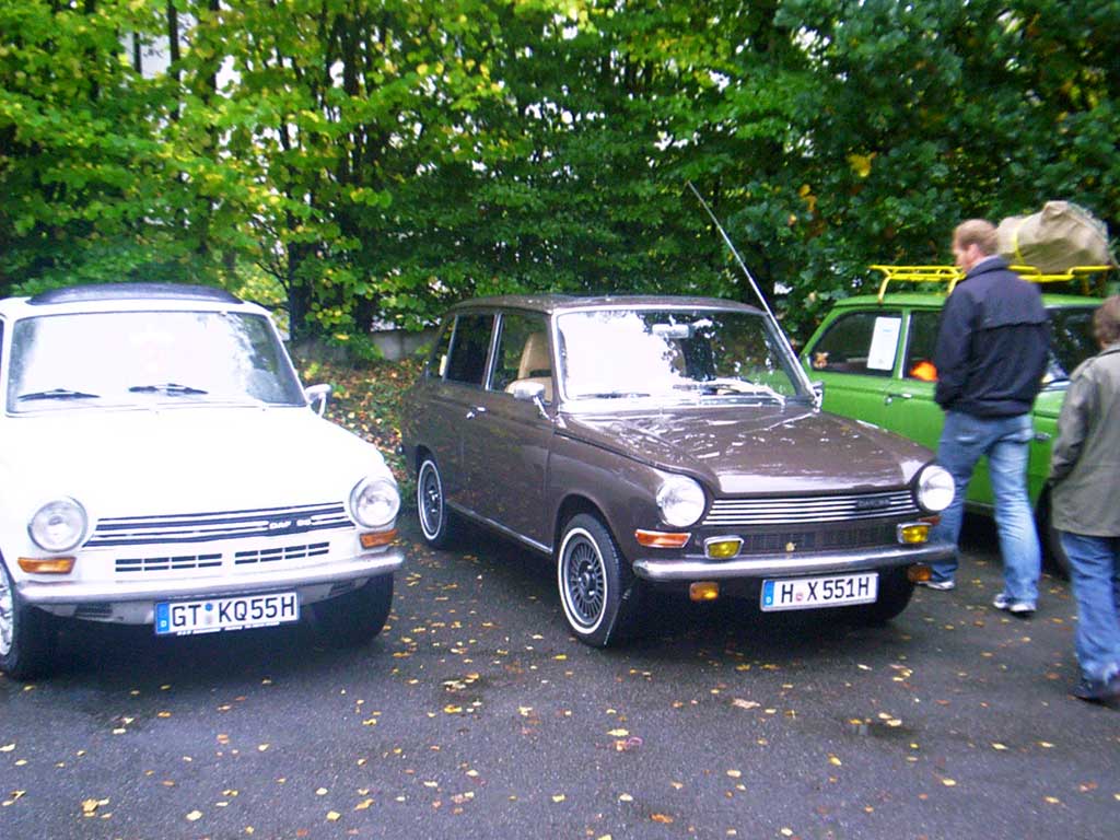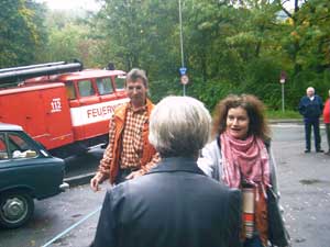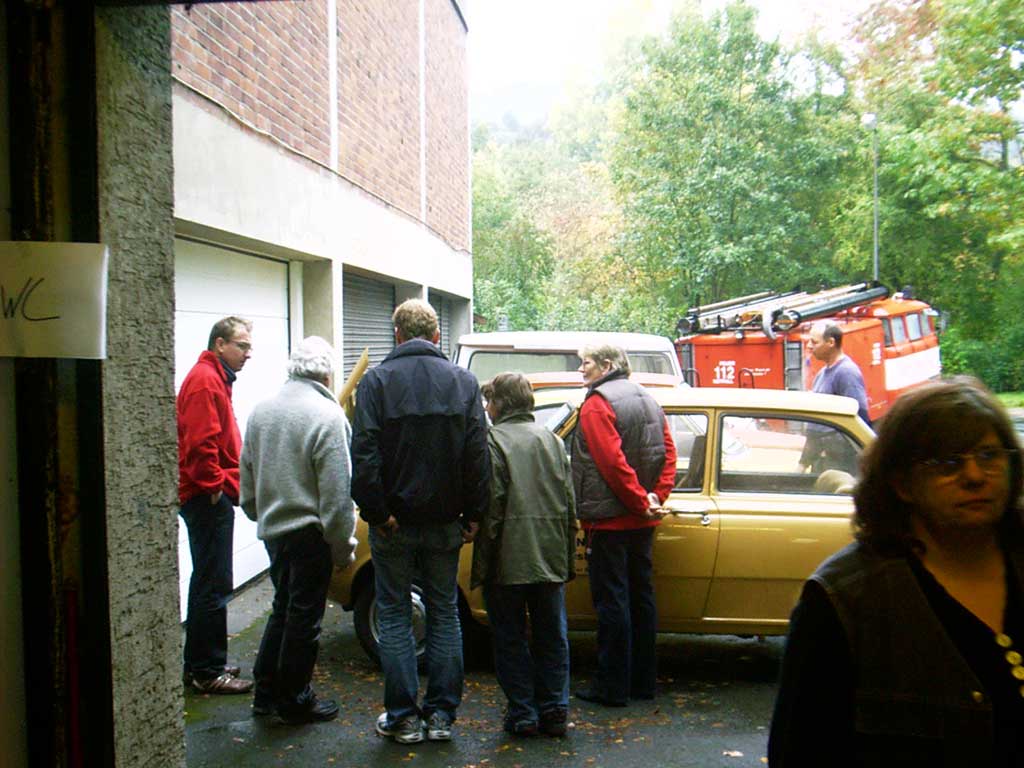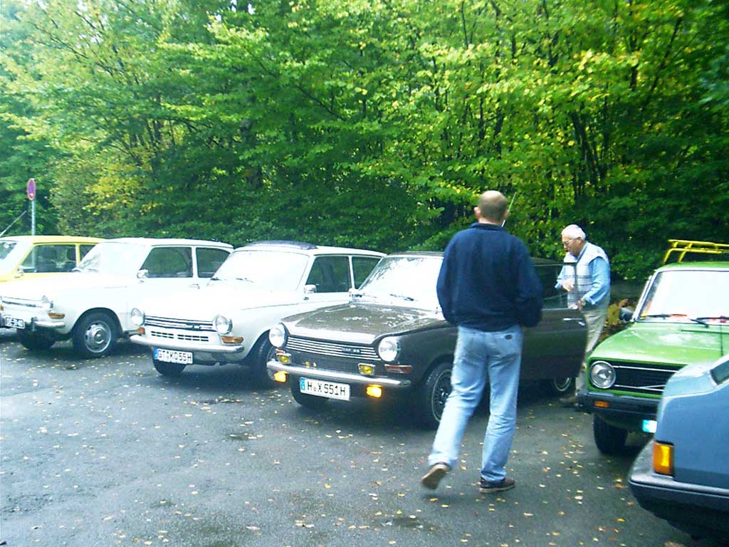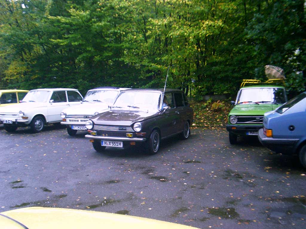Zwei Gäste kommen standesgemäß im ( blauen ) 340er Volvo