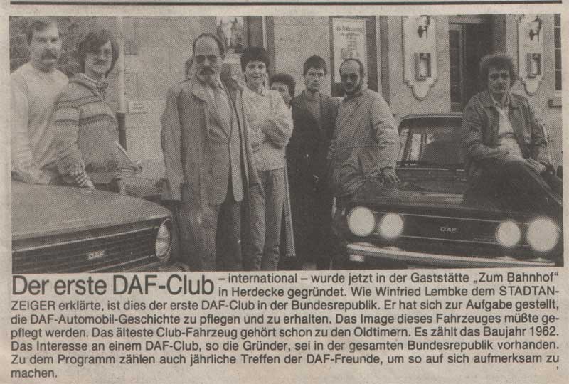 Um ein Stück Automobilgeschichte zu erhalten, trafen sich am 17. November 1985 ein paar Daf Freunde, um die Zeit der "IG Dafclub International" zu beenden und einen richtigen Verein zu gründen. Die Idee zu dieser Vereinigung hatte Winfried Lemke, der auch schon seit Monaten im Herdecker Umfeld kleine Zettelchen mit folgendem Aufruf verteilte: " Daf-Club Interesse ? Tel:..". So fanden sich dann in der Bahnhofsgaststätte in Herdecke 10 Gründungswillige ein, um sich eine Satzung zu geben. Gründungsmitglieder waren: