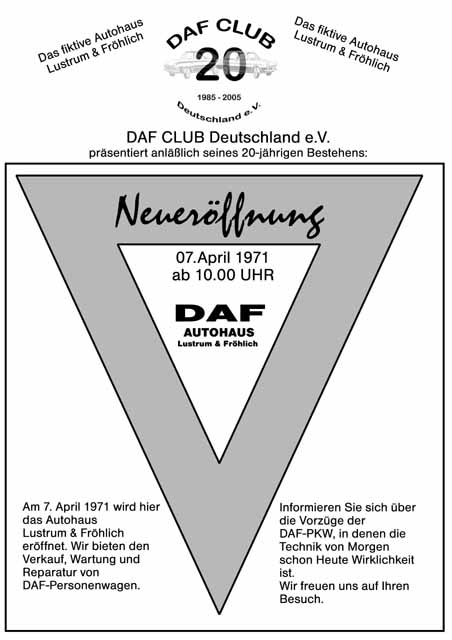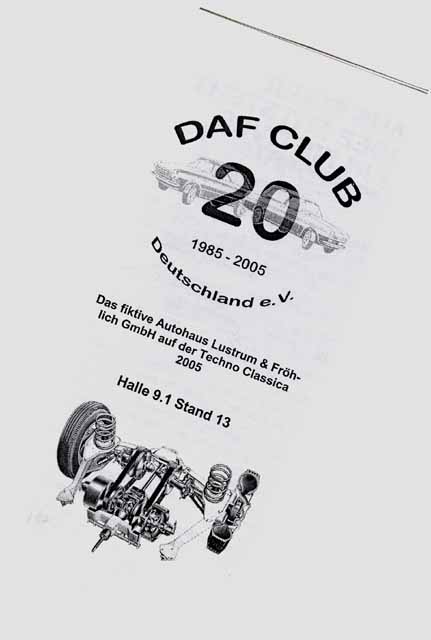 Gerne beantworten wir Ihre Fragen rund um unser Autohaus, die ausgestellten Fahrzeuge, die wechselvolle Geschichte der DAF-PKW und natürlich zu uns, dem DAF CLUB DEUTSCHLAND e.V. der in diesem Jahr (2005) sein zwanzigjähriges Bestehen feiert.
